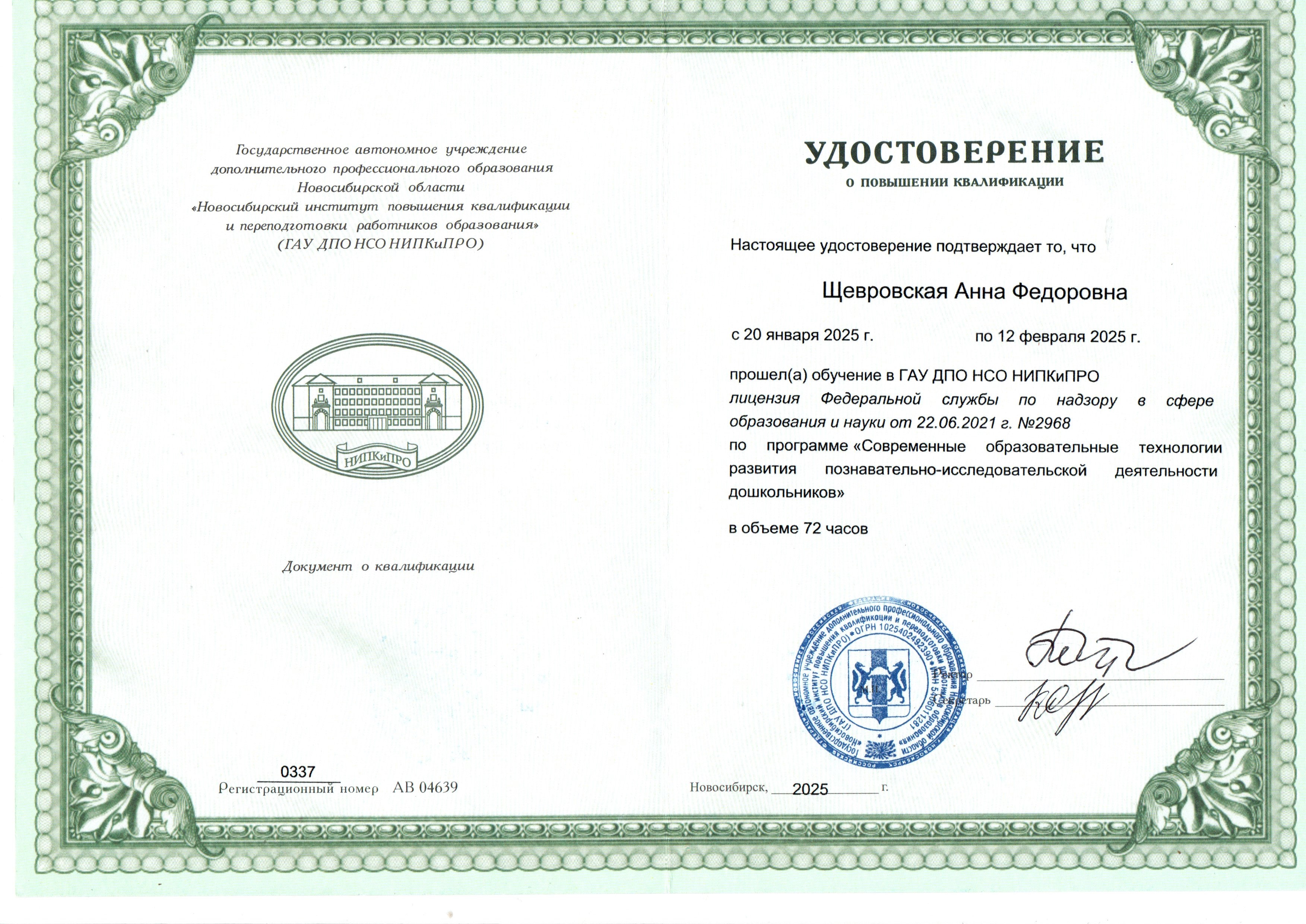 Удостоверение о повышении квалификации ГАУ ДПО НСО НИПКиПРО "Современные образовательные технологии развития познавательно-исследовательской деятельности дошкольников".2025г.