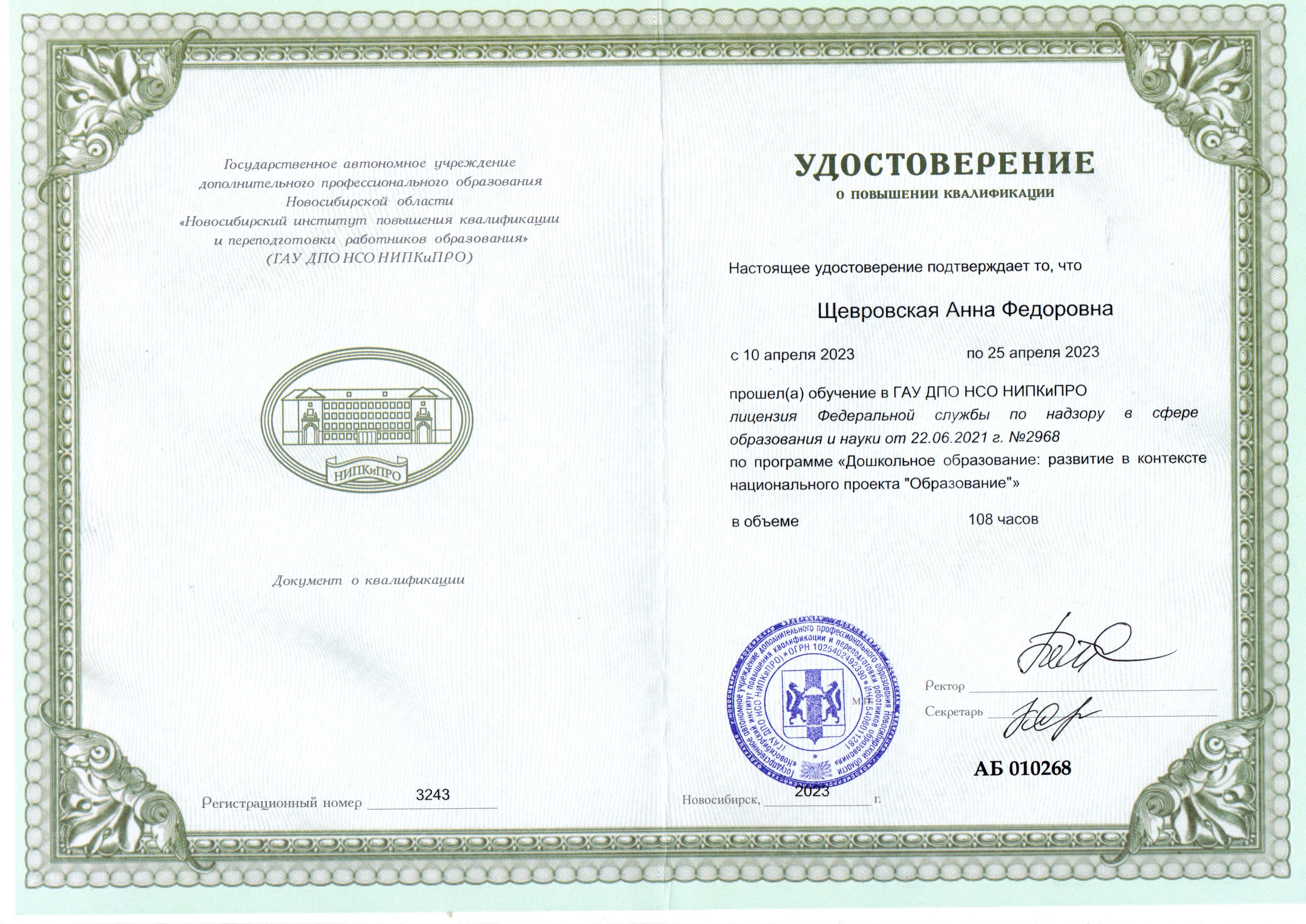 Удостоверение о повышении квалификации ГАУ ДПО НСО НИПКиПРО "Дошкольное образование: развитие в контексте национального проекта "Образование". 2023г.
